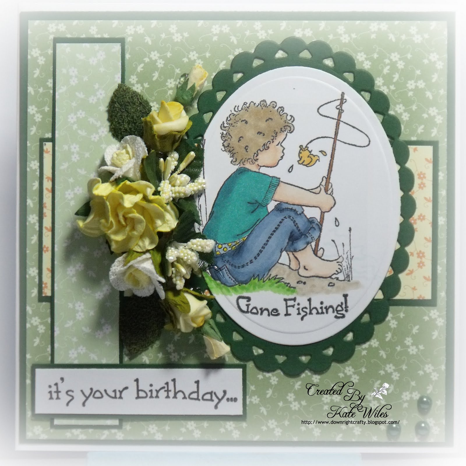 The base layer and contrast colour is lemon yellow. The image has been die cut with the smaller of the grand Oval Nesties and the image plate is layered onto the same sized scallop oval. I have used an MS punch and some Papermania Mono Collection ribbon, along with some gorgeous pearls from the Hobby House. The sentiments are both My Sentiment Exactly. Flowers are a mixture of Hobby Craft, local department store and Wild Orchid. The little silver fish charm I am sorry cannot remember where he came from