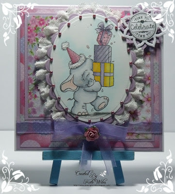 Beautiful card Kate. Love the ruffled lace behind the Nestie oval. That image is so cute too.
